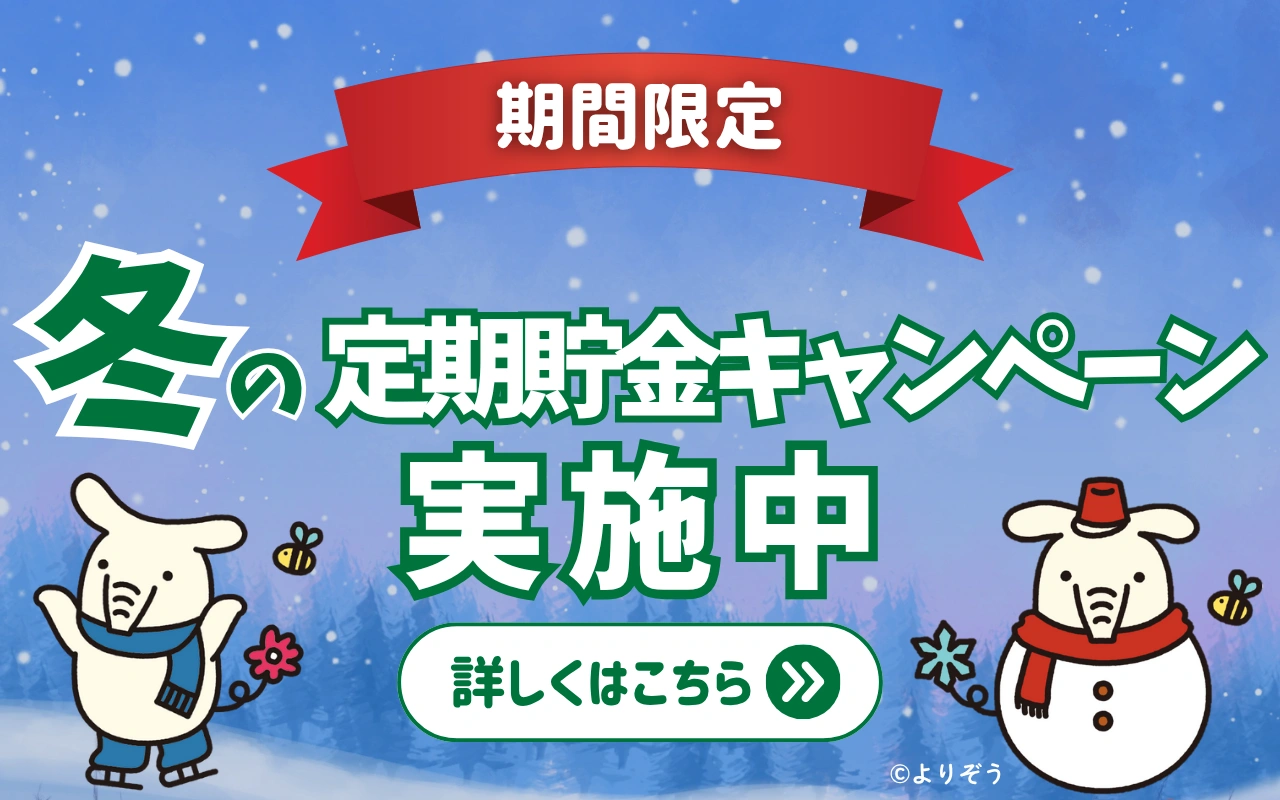 - 預入時の利率が満期日まで変わらない「確定利回り」。預入期間3年以上なら半年複利の運用でさらにお得です。